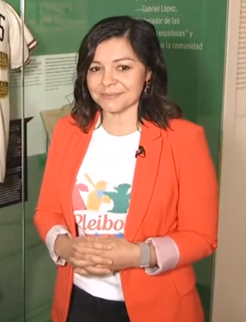 Margaret is wearing an orange jacket.