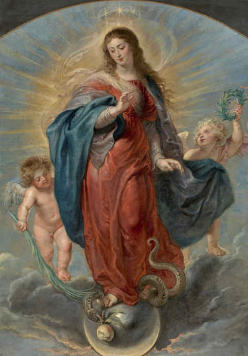 “… she shall crush your head, and you shall lie in wait for her heel.” changed to He and Him. Gen. 3:15. “Hail full of Grace.”